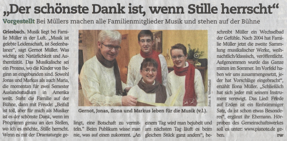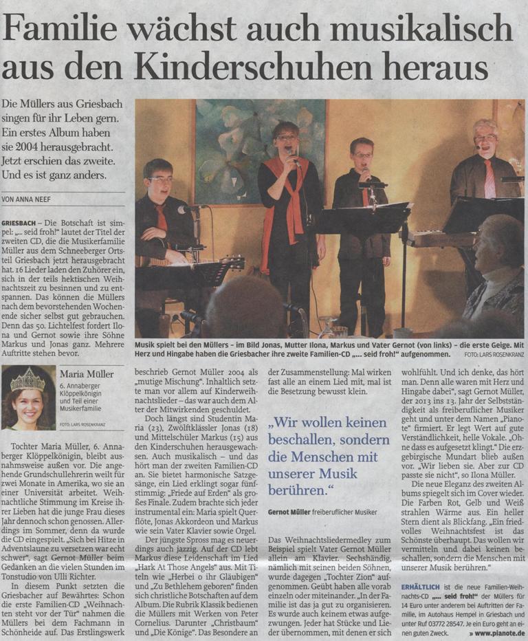 Griesbach.Die Botschaft ist simpel:"seid froh!"lautet der Titel der zweiten CD, die die Musikerfamilie Müller aus dem Schneeberger Ortsteil Griesbach jetzt herausgebracht hat. 16 Lieder laden den Zuhörer en, sich in der teils hektischen Weihnachtszeit zu besinnen und zu entspannen…