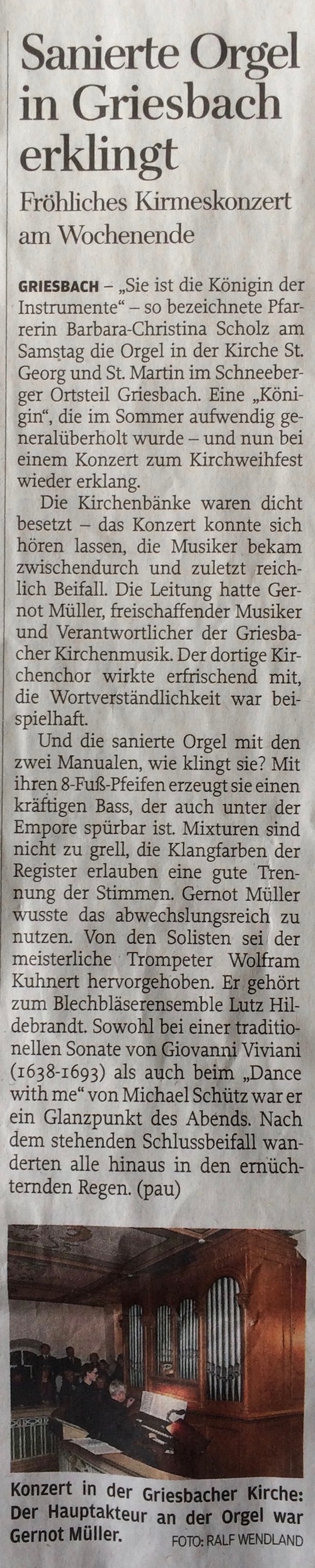 in der Kirche St. Georg und St. Martin im Schneeberger Ortsteil Griesbach. Eine "Königin", die im Sommer aufwendig generalüberholt wurde- und nun bei einem Konzert zum Kirchweihfest wieder erklang ... Artikel lesen