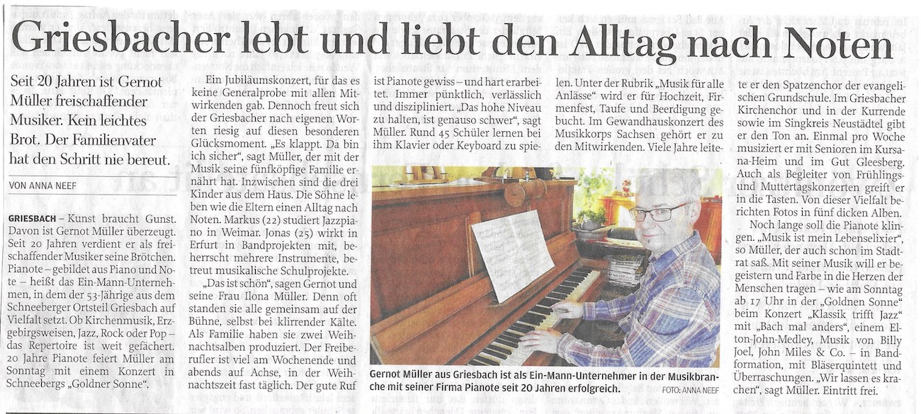 Griesbach - Kunst braucht Gunst. Davon ist Gernot Müller überzeugt. Seit 20 Jahren verdient er als freischaffender Musiker seine Brötchen. Pianote - gebildet aus Piano und Note - heißt das Ein-Mann-Unternehmen ... Artikel lesen
